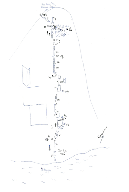 Για να μην τα πολυλογούμε, τα παιδιά ακολούθησαν την νεροσυρμή στο μεγαλύτερο μέρος της, η οποία είχε σημάδια επαναλήψεων όπως δύο καρφιά, κάτι σχοινιά σε διαμπερή κτλ. Γνωρίζω ότι σε αυτή την διαδρομή έχουν μπεί κατα καιρούς 5-6 σχοινοσυντροφιές εκ των οποίων οι περισσότερες είχαν περιπέτειες (άλλοι επάνω, άλλοι υποχωρήσεις, άλλοι τραυματισμούς και υποχωρήσεις).